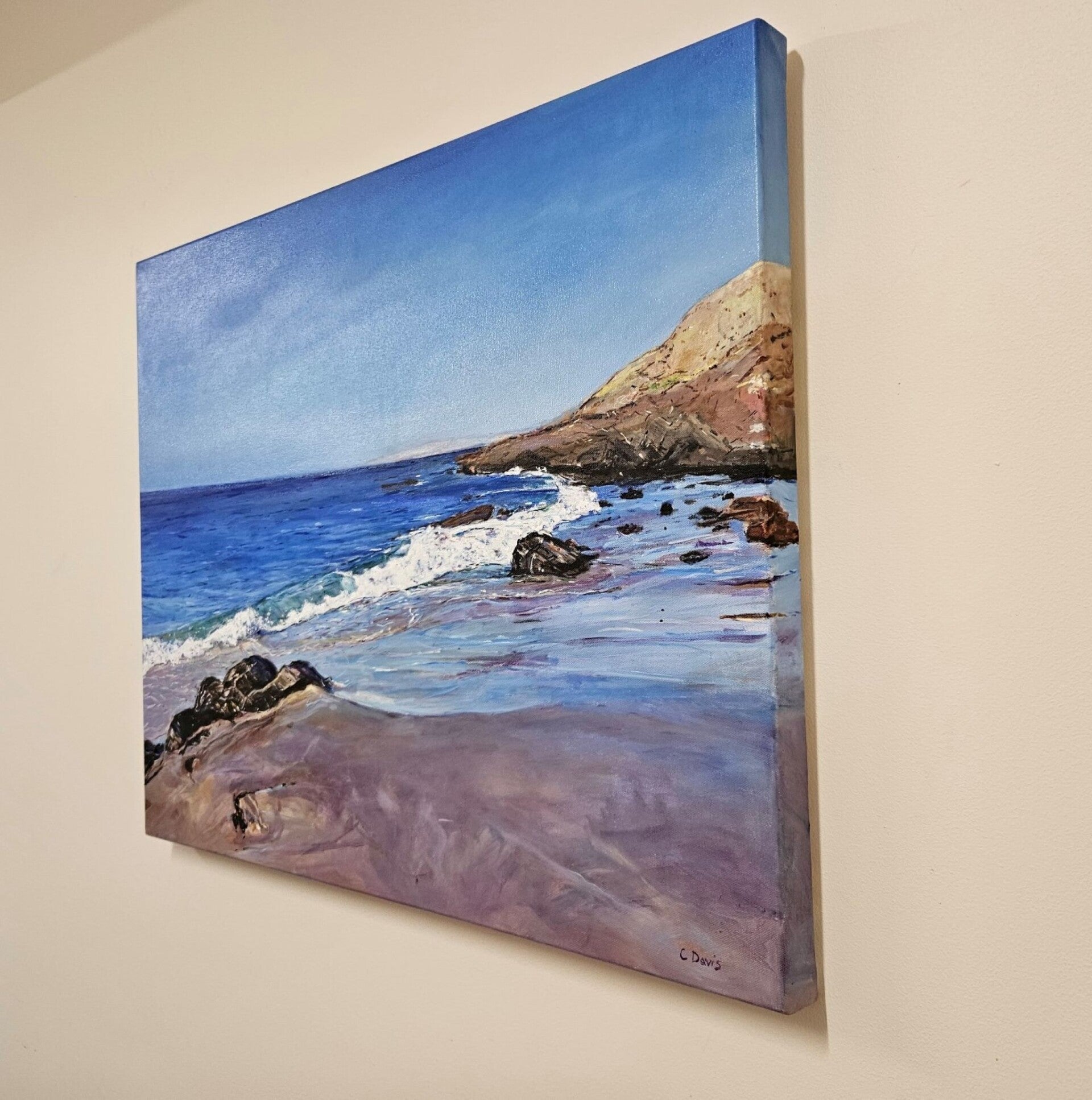 The Second Valley beach no2 oil painting was created from a reference photo I captured while standing on Second Valley beach which is a small beach of the Fleurieu Peninsula, South Australia. The sand is wet under my feet, the sky and sea a bright blue.