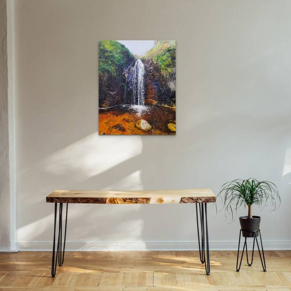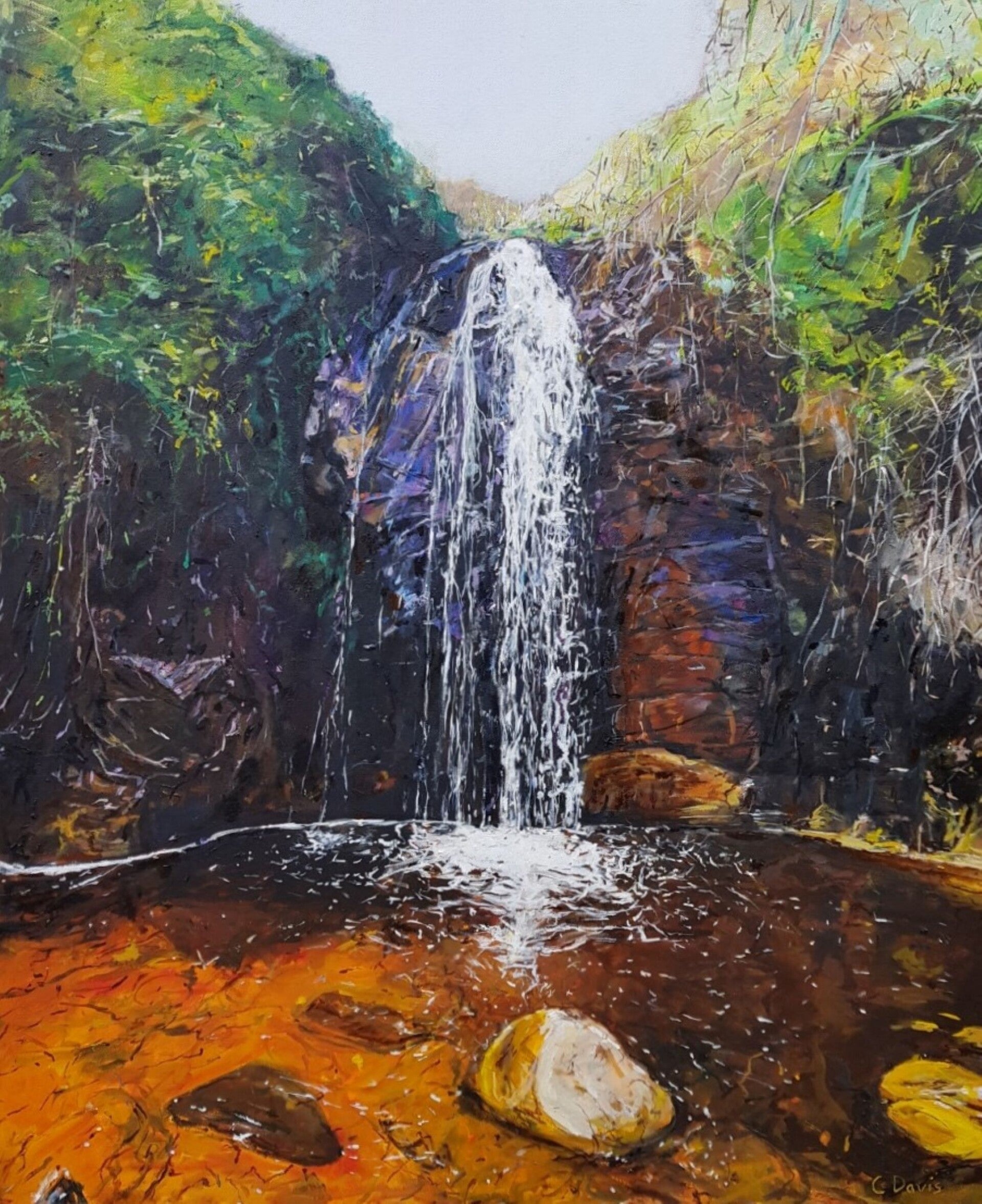 I took the reference photo for this painting while viewing the Second Waterfall at Waterfall Gully. Waterfall Gully is located in the foothills of the Mount Lofty Ranges of South Australia. The dark rocks have hints of purple and blue from the glistening sun. The white water is a strong contrast to the dark rock face and the colours of the water and rocks beneath.