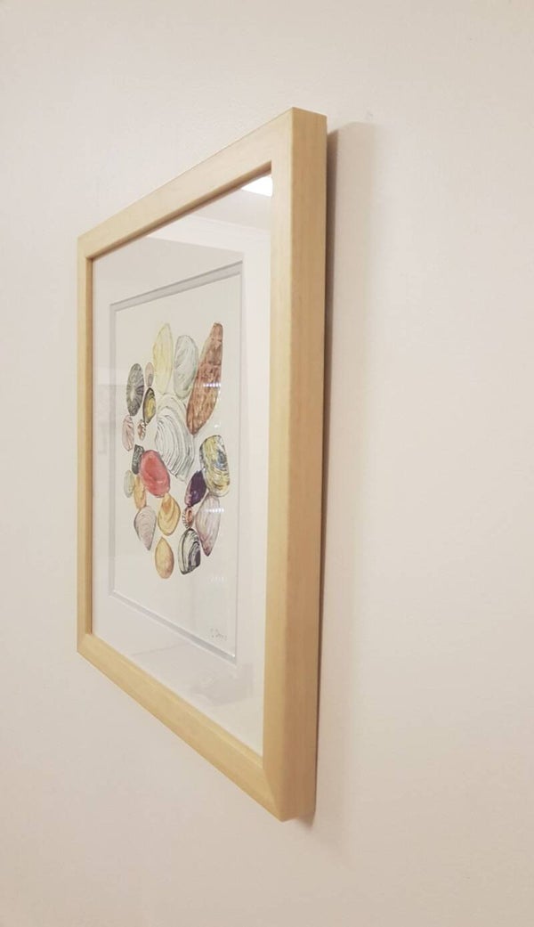 Circle of shells is a watercolor painting of a variety of shells picked up on Tennyson beach in South Australia displaying their unique colors, lines and patterns.