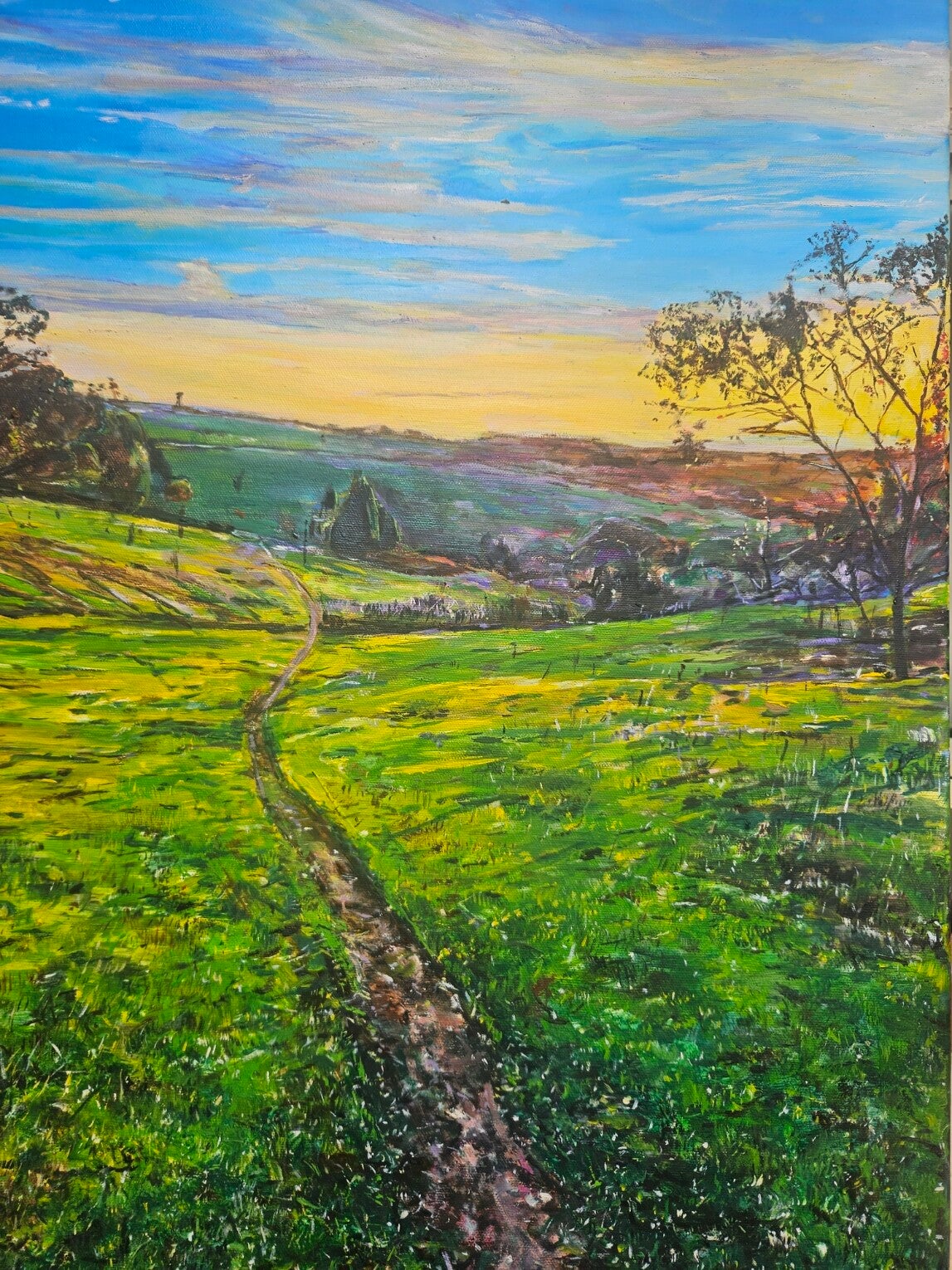 Experience the serene beauty of "Sunset Pathway," an original impressionist oil painting on canvas. This captivating landscape artwork invites you into a scene where a winding path meanders through fields of lush green, bathed in the soft, warm glow of a sunset sky. Delicate trees frame the view, their forms adding a gentle contrast to the expansive, tranquil atmosphere.