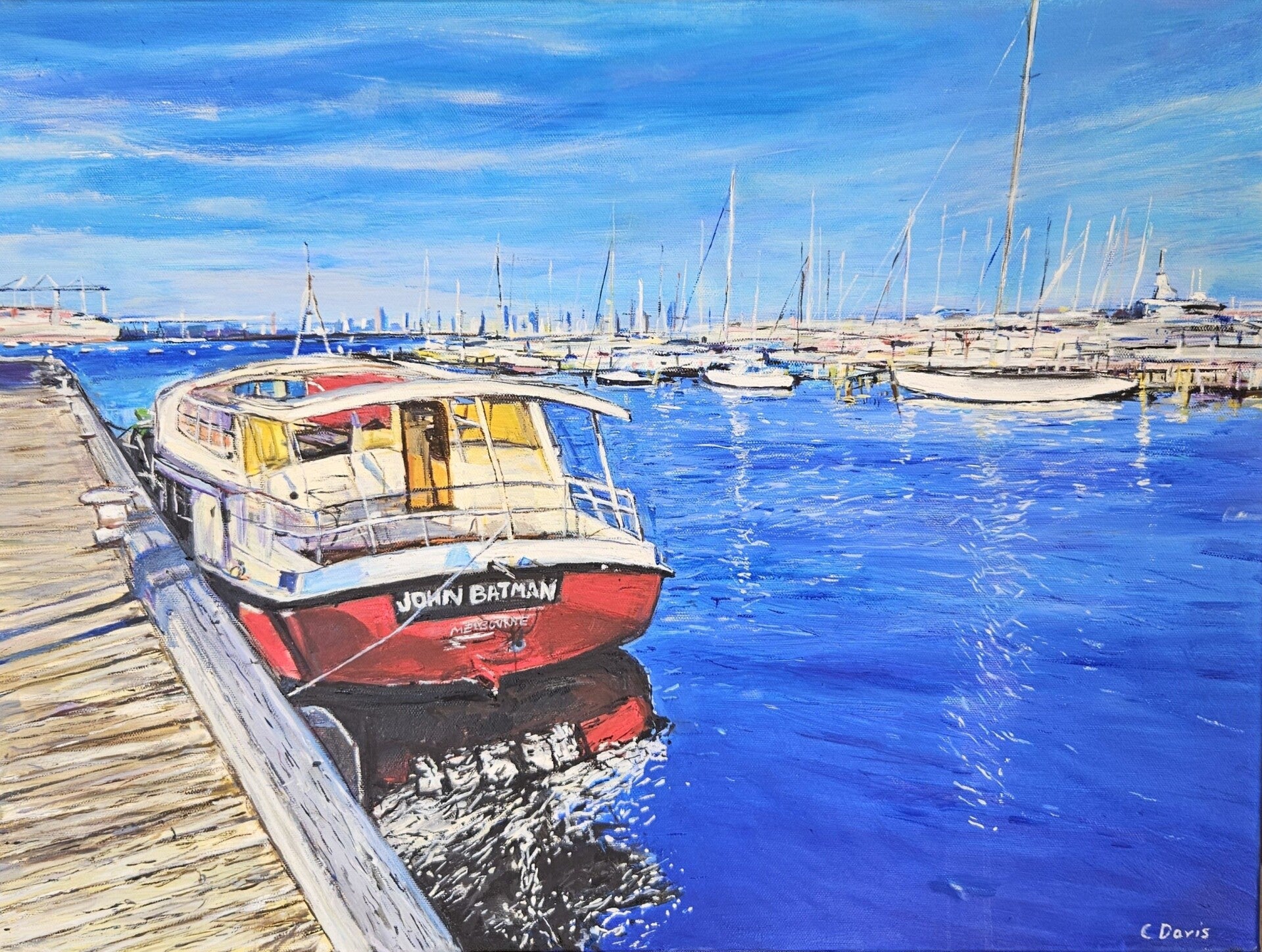 The vibrant oil painting captures a serene moment at Williamstown Wharf, Melbourne. The focal point is the ‘John Batman,’ a charming red and white boat, gently moored at the wooden pier. Its name, clearly visible on the hull, adds a touch of local character to the scene. The boat’s slightly weathered appearance hints at a life spent navigating the waters, suggesting stories of journeys and adventures. The surrounding calm waters reflect the bright blue sky and the masts of numerous sailboats, subtly dotted across the horizon, creating a sense of peaceful activity. The artist skillfully uses impasto techniques with visible brushstrokes, adding texture and dimension to the water’s surface, mimicking the gentle movement of the waves. The city skyline, a hazy line of buildings in the distance, frames the harbour, subtly suggesting a bustling urban life beyond the peaceful marina. The colour palette is dominated by blues – from the deep azure of the water to the lighter, almost ethereal tones in the sky – which creates a cool, tranquil atmosphere. The artist’s use of light is masterful, highlighting the sun-drenched wood of the pier and the reflections dancing across the water’s surface. This creates a contrast with the slightly shadowed areas of the boat, adding a three-dimensional quality to the piece. The perspective of the painting, with the pier leading towards the boat and the cityscape, invites the viewer into the scene. It’s an inviting depiction of a peaceful day at the marina, a perfect postcard capturing the essence of Melbourne’s maritime beauty and the spirit of relaxation it offers. The overall impression is one of calm contemplation and enjoyment of a sunny day by the water’s edge, offering a visual respite and a sense of tranquil escape. The style is contemporary, possibly Impressionistic in its handling of light and water, conveying the feeling of the scene more than strict realism, yet with enough detail to be utterly captivating and evocative of Melbourne’s picturesque waterfront. The work invites the viewer to imagine themselves there, perhaps sitting on the pier, enjoying the gentle sounds of the sea and the sun on their face, truly embodying the peaceful tranquility of the scene captured in this stunning artwork. The use of expressive brushwork complements the overall calming and beautiful nature of the piece.