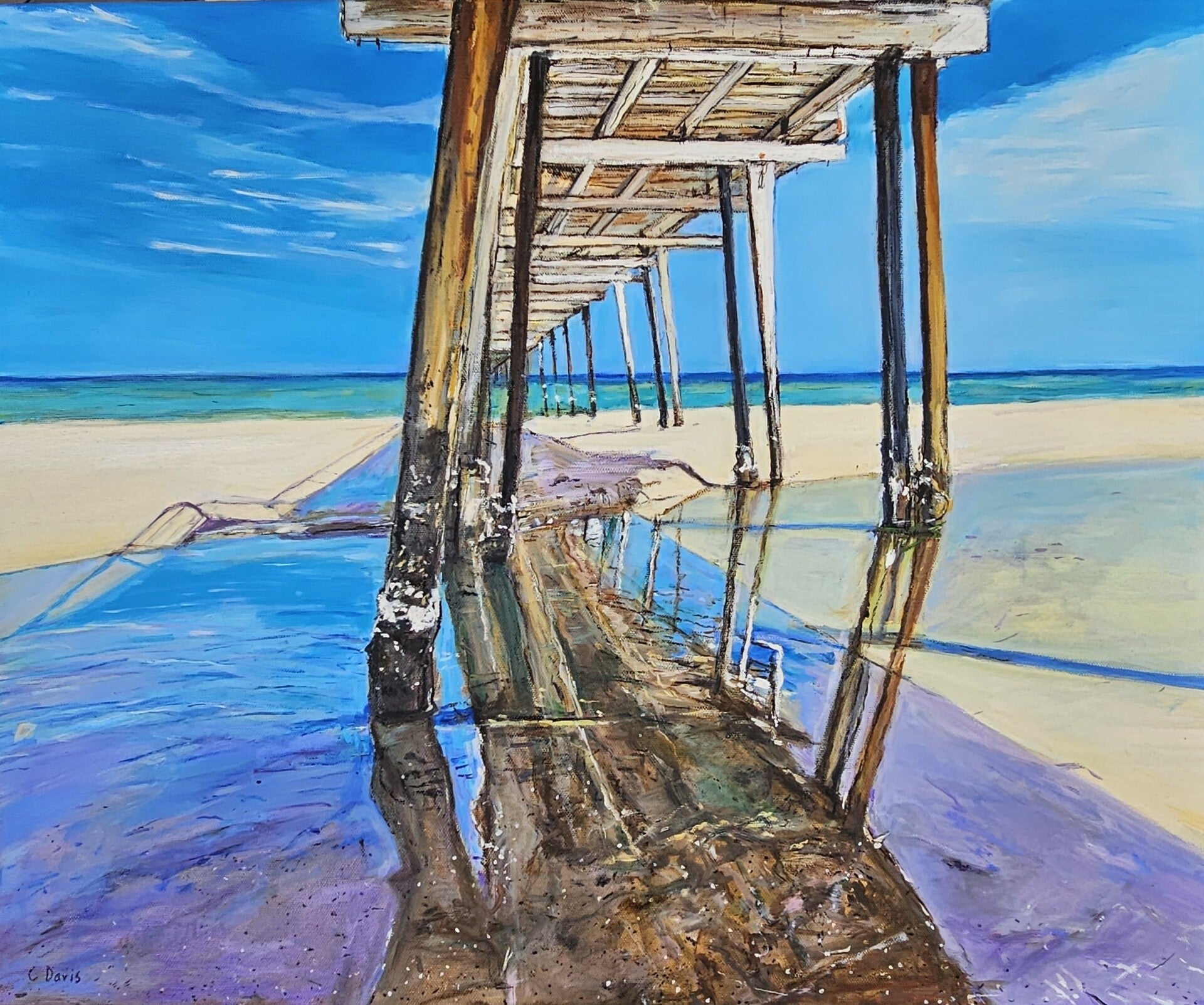 The painting ‘Beneath the Pier’ captures a tranquil coastal scene, inviting the viewer to explore the serene space beneath a weathered pier. The perspective is unique, positioned low to the ground, offering an intimate view of the water’s edge and the intricate details of the pier’s structure. Sunlight filters through the gaps between the wooden beams, creating dappled patterns on the water’s surface, while the reflections of the pier and the sky merge to create a mesmerizing interplay of colors and forms. The artist employs a vibrant palette of blues, purples, and sandy yellows to depict the calm water, reflecting both the blue sky and the ochre tones of the beach. The wooden pilings of the pier, worn and showing signs of age and the relentless embrace of the sea, stand like silent sentinels, guarding the secrets of the ocean.