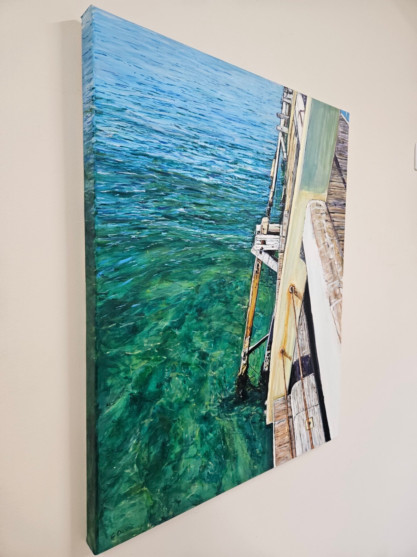 'Jetty Serenity' presents a captivating view of a weathered pier extending over crystal-clear waters. The interplay of light and shadow reveals the intricate textures of the wooden structure, while the vibrant greens and blues of the water below evoke a sense of tranquility. The artist skillfully captures the serene beauty of nature, inviting contemplation and reflection. This piece would make a striking addition to any space, enhancing the atmosphere with its calming presence.