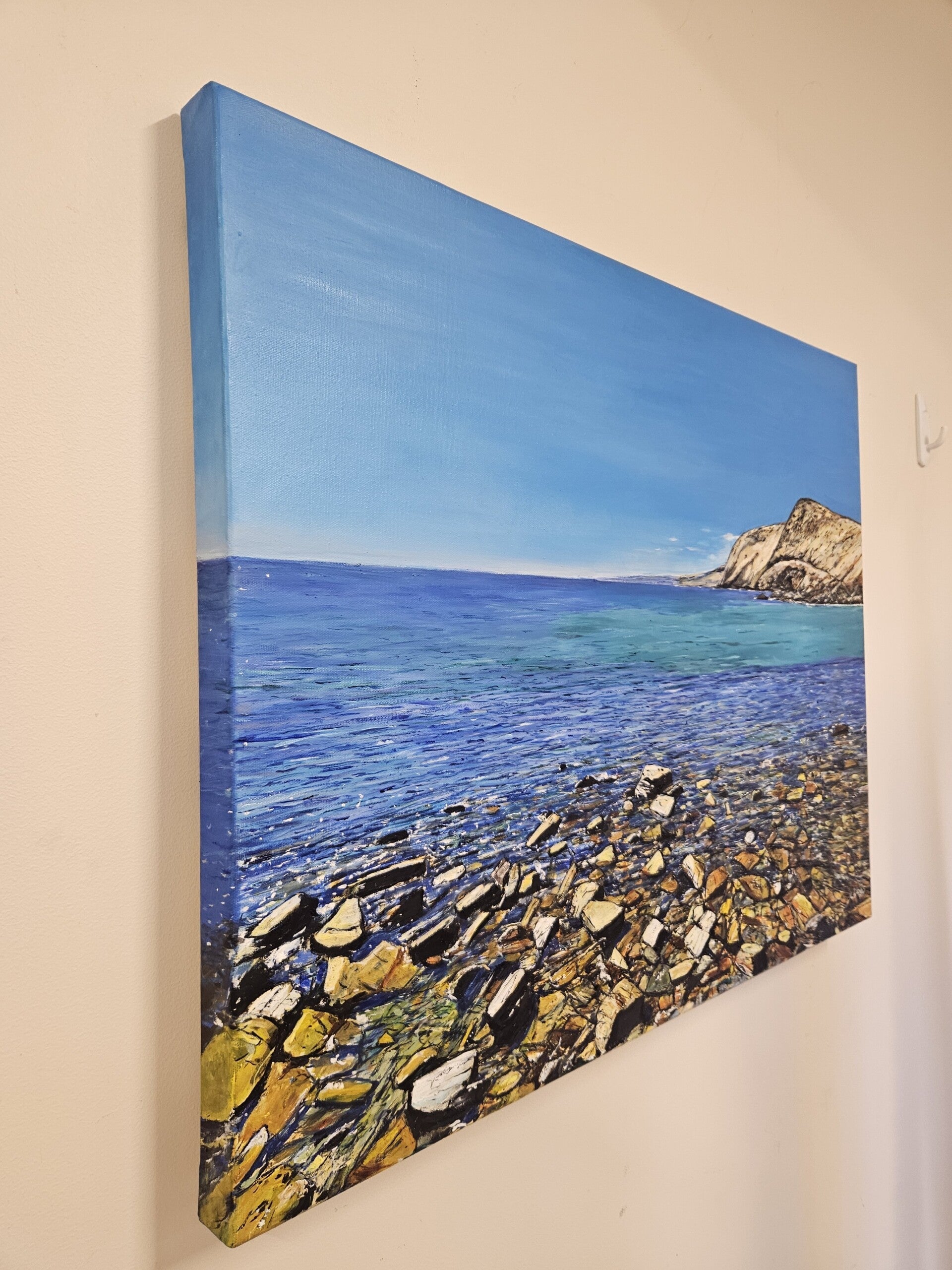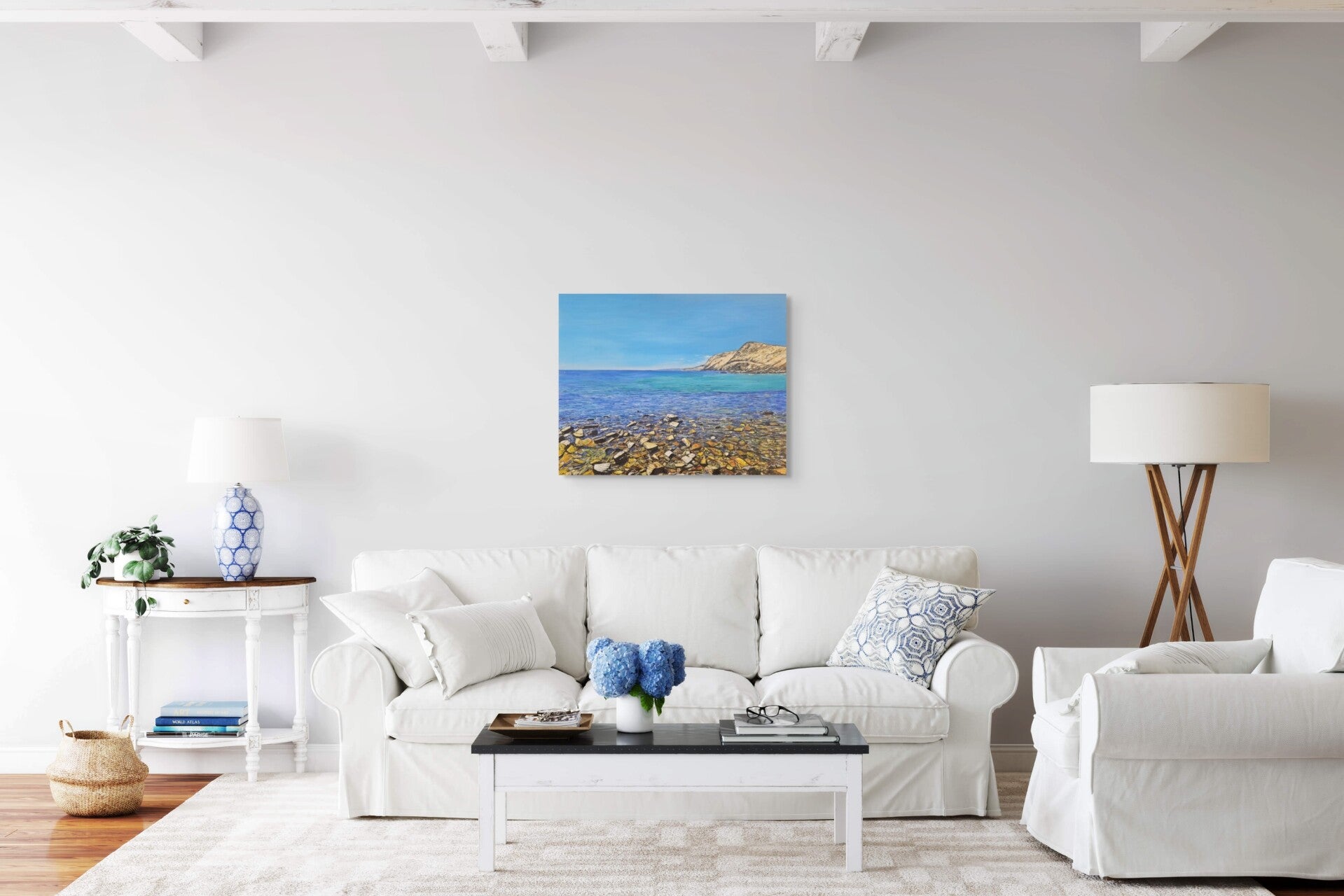 A quiet horizon over Second Valley waters presents a serene seascape where sun-warmed rocks give way to clear turquoise water and a wide, calm sky. Warm ochres and cool grays in the shoreline contrast with layered blues in the sea, while the distant headland adds depth and a sense of quiet solitude. Fine detail and subtle tonal shifts convey stillness without sentimentality. A quietly striking addition to bring coastal calm to your space.